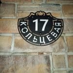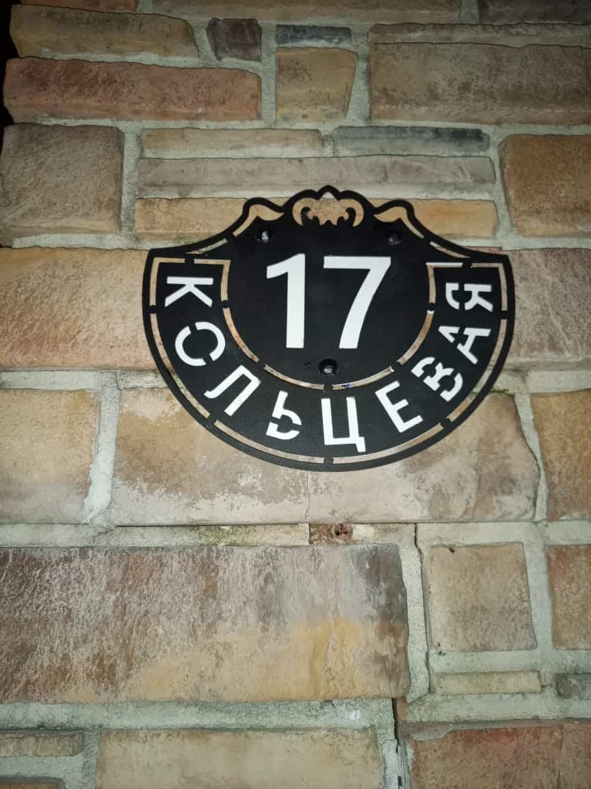 Для адресной таблички был выбран ретро-дизайн. Название улицы расположено в нижней части полуокружности, в центре изделия указан номер дома (Кольцевая, 17). Верхняя часть декорирована симметрично расположенными коваными элементами. Получилось лаконично и красиво.