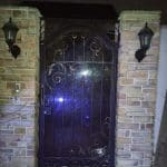 Кованую калитку с художественным оформлением мы встроили в кирпичное ограждение, расположенное по периметру частного дома. Основа конструкции — вертикально расположенные стальные прутья, дизайнерское оформление представляет собой — цветочный орнамент (в нижней и верхней части калитки).