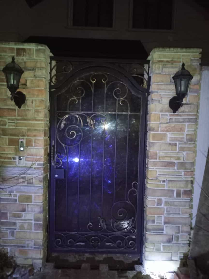 Все части изделия покрыты грунтовкой и противокоррозионным составом, финишное покрытие — стойкая к атмосферным факторам черная краска с глянцем (заказчик выбрал практичный цвет). С двух сторон от входа расположены настенные фонари, придающие завершенность архитектурной композиции.
