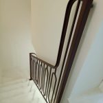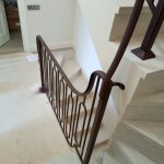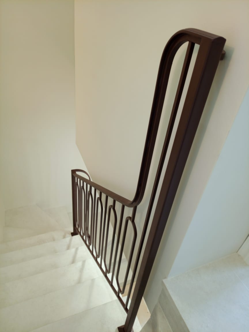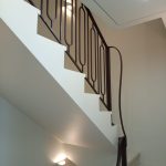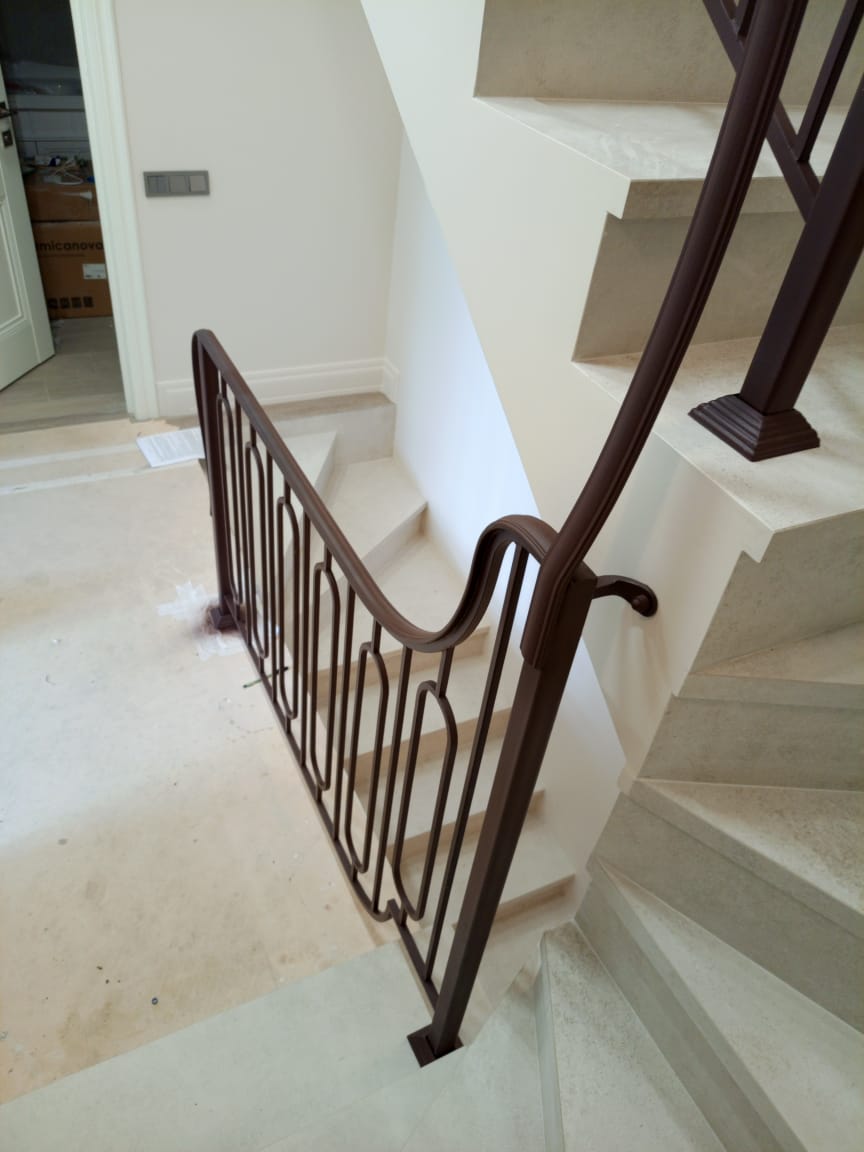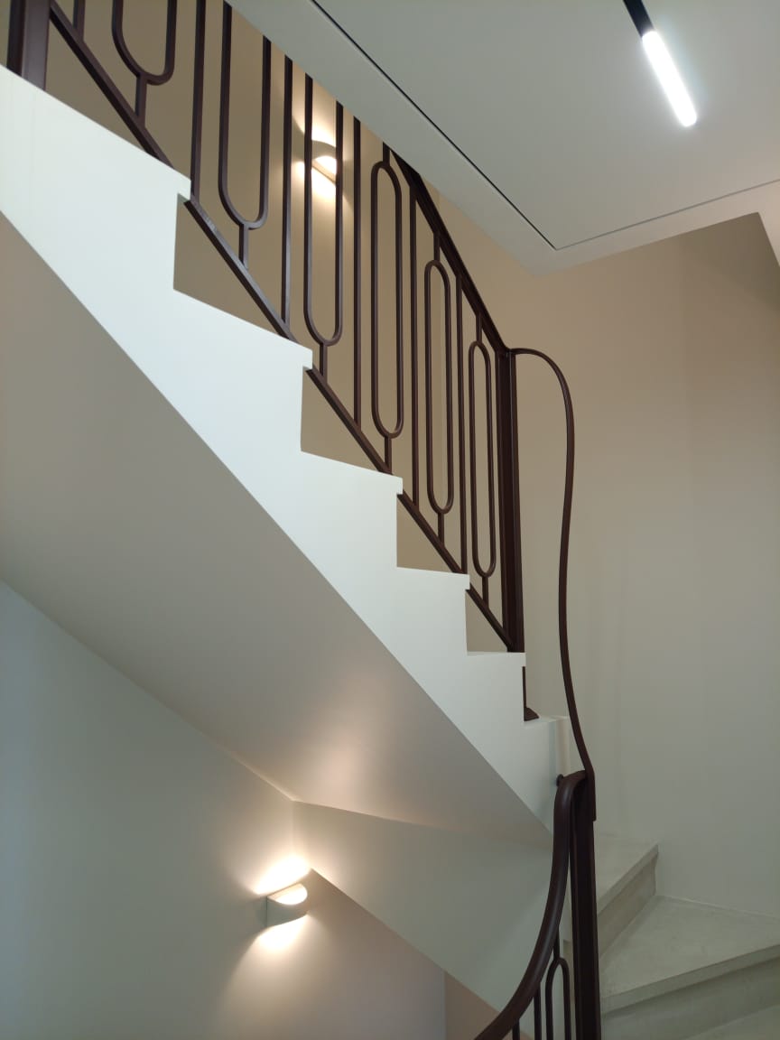 Ещё одно кованое ограждение создано для винтовой узкой лестницы в коттедже. Заполнение — вытянутые фигуры на небольшой опоре, поручни — в виде изогнутой плавной линии, опорные столбы массивные, с широкой чашей. Конструкция ограждения лестницы с радиусным забегом надёжная и достаточно высокая, что обеспечивает эксплуатационную безопасность, в том числе для детей.