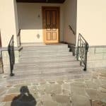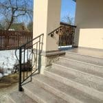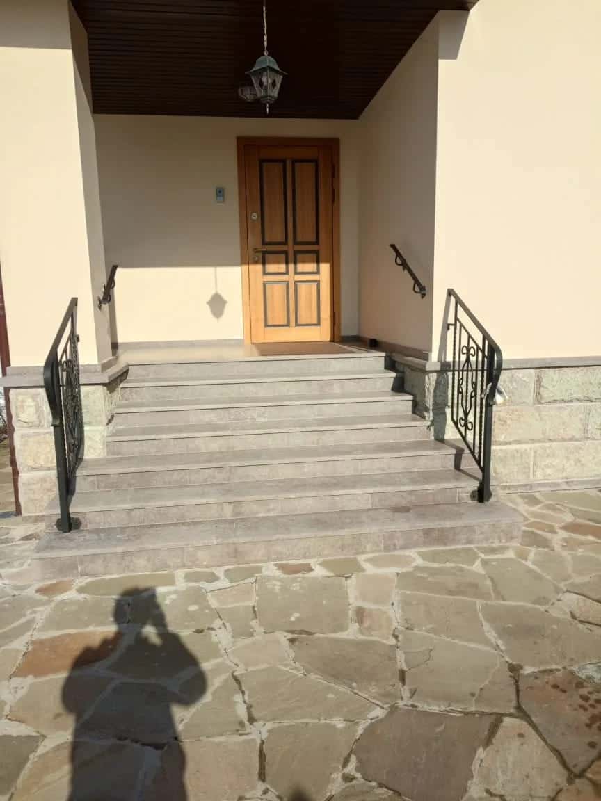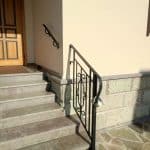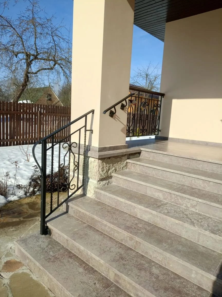Одна из последних работ — изготовление и монтаж ограждения для крыльца и пристанных поручней. Кованые стальные перила, расположенные вдоль каменных ступеней, гармонично вписались в архитектурный дизайн здания. Заполнения перил — вертикальные балясины с центральным декоративным рисунком, образованном плавными линиями.