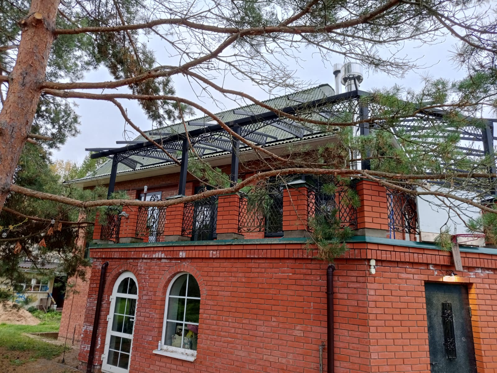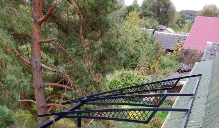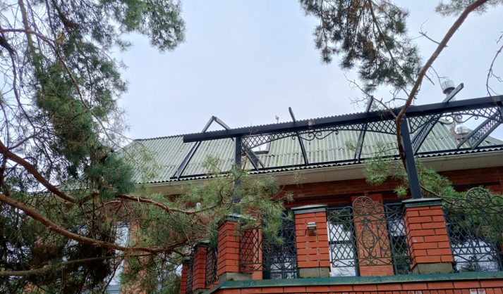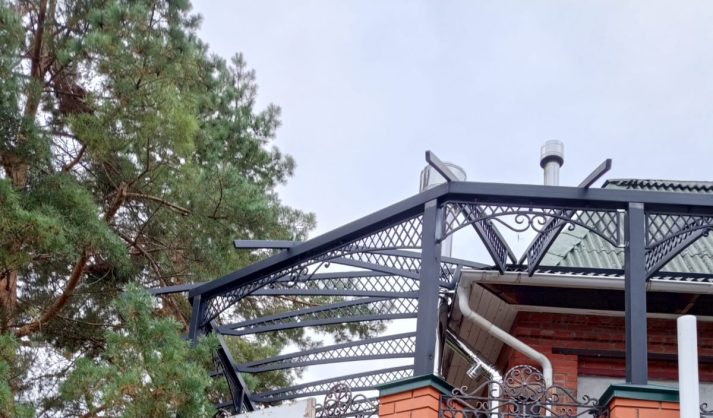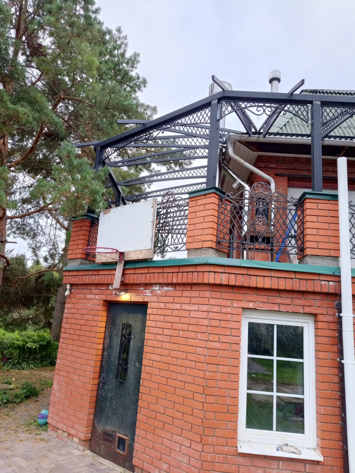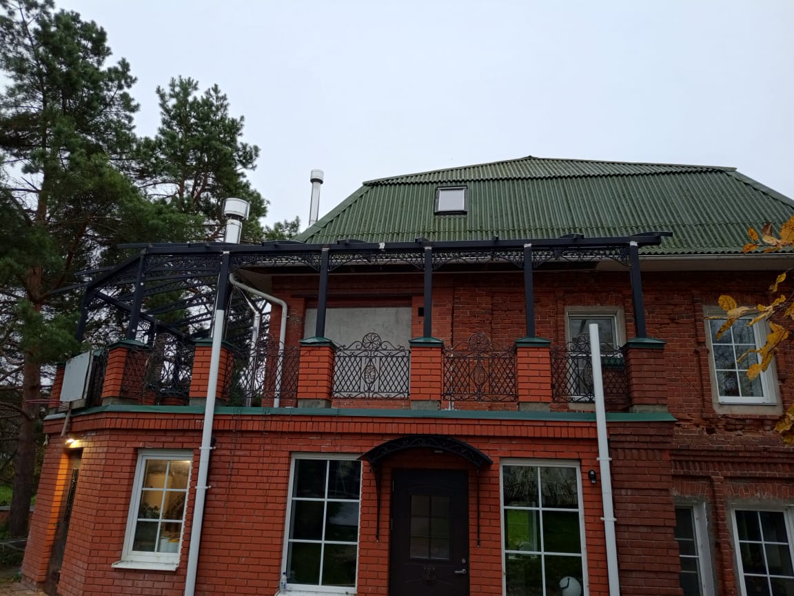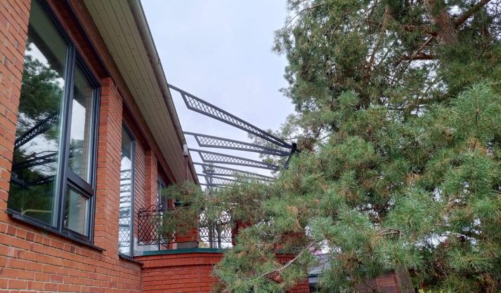 В перечне последних работ Тульского завода художественной ковки, — изготовление и монтаж кованого навеса Г-образной формы (9,0*8,0 м). Навес представляет собой оригинальную по дизайну металлическую конструкцию, установленную на втором этаже здания. Основные функции ограждения — защита от солнца и механических повреждений. Навесная система с элементами художественной ковки (решетка и сеточка) играет также роль декоративной составляющей архитектурной композиции.