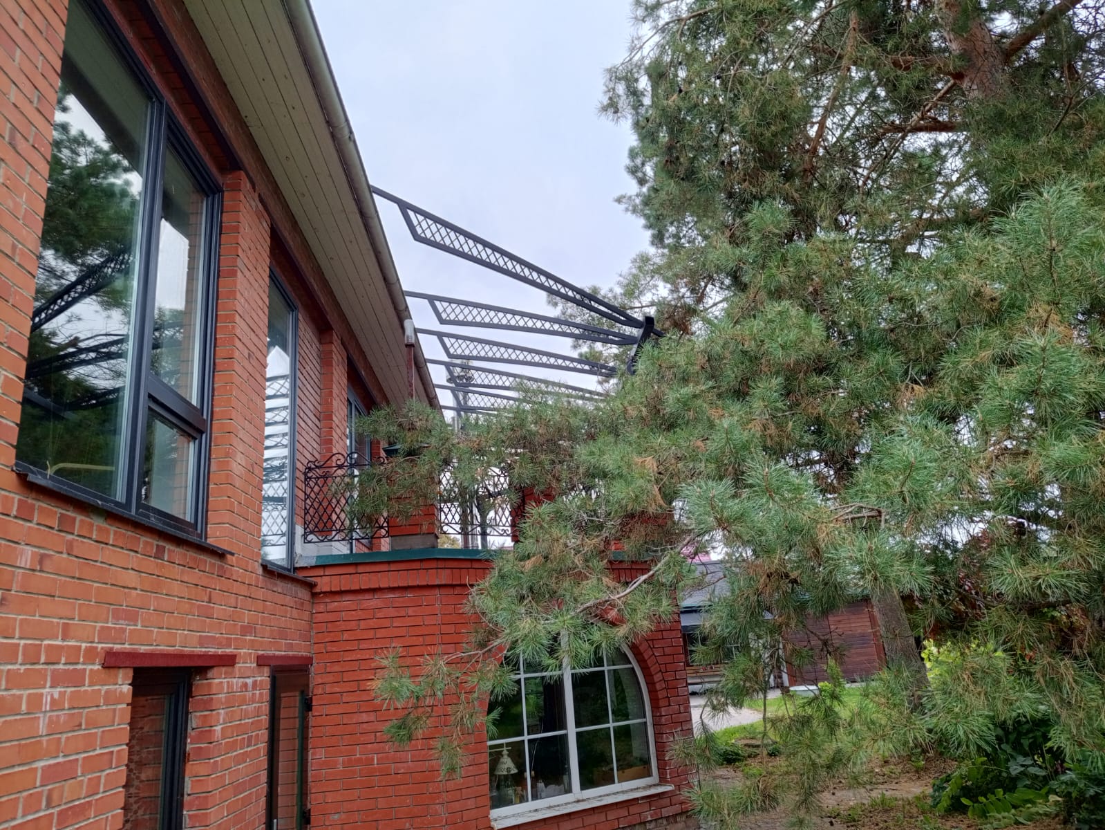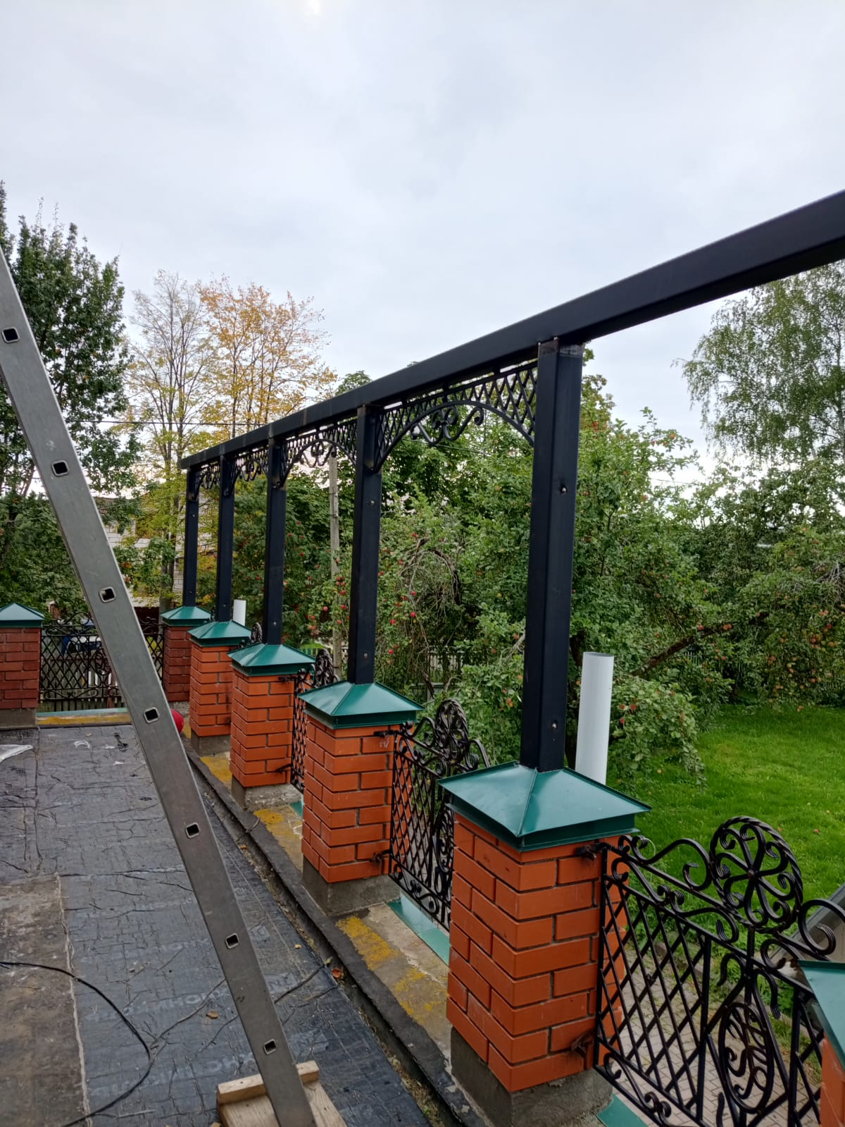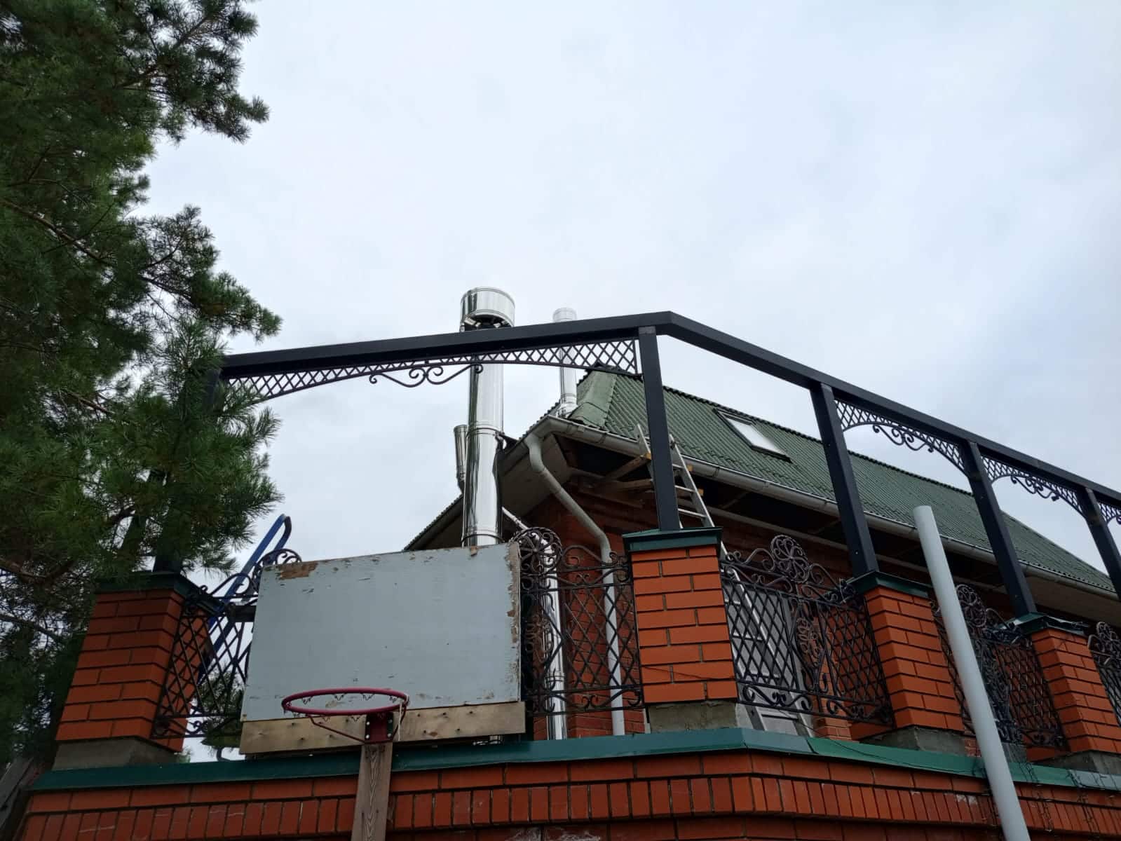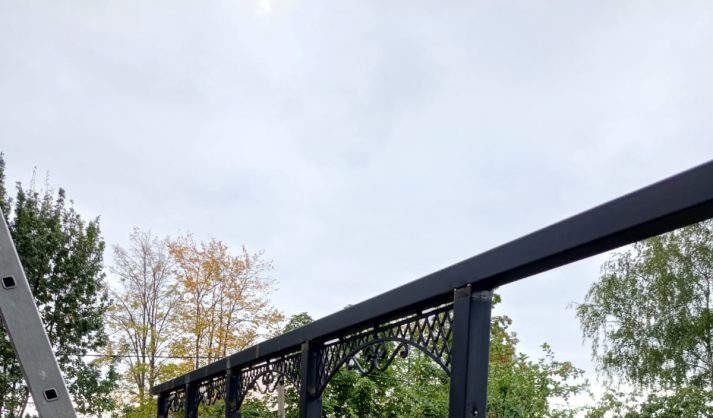 Горизонтальная балка закреплена на крыше, вертикальные стойки соединяются с кирпичными ограждающими столбами. Чёрный металл (внешнее покрытие — порошковая износостойкая краска WS-Plast) красиво сочетается с кирпичным фасадом, и делает внешний вид здания более выразительным. Все работы выполнены точно в срок, в соответствии с технологическими правилами и нормативами. Клиент остался полностью доволен результатом.
