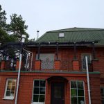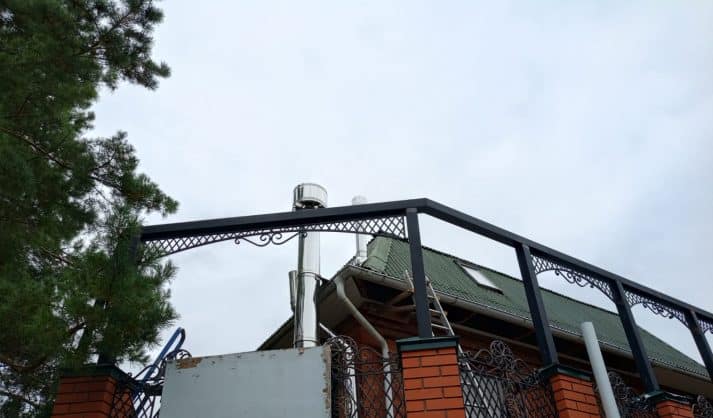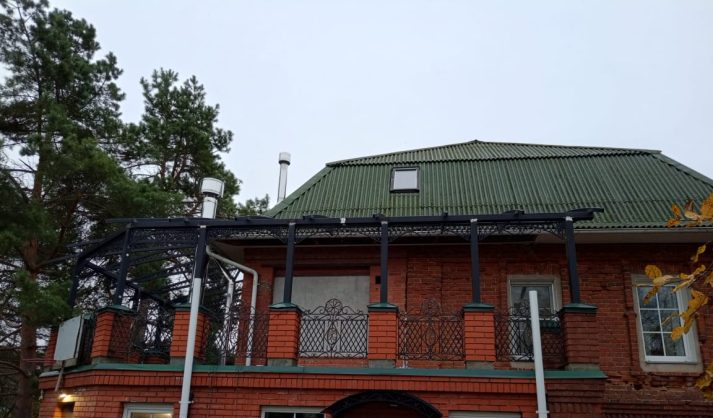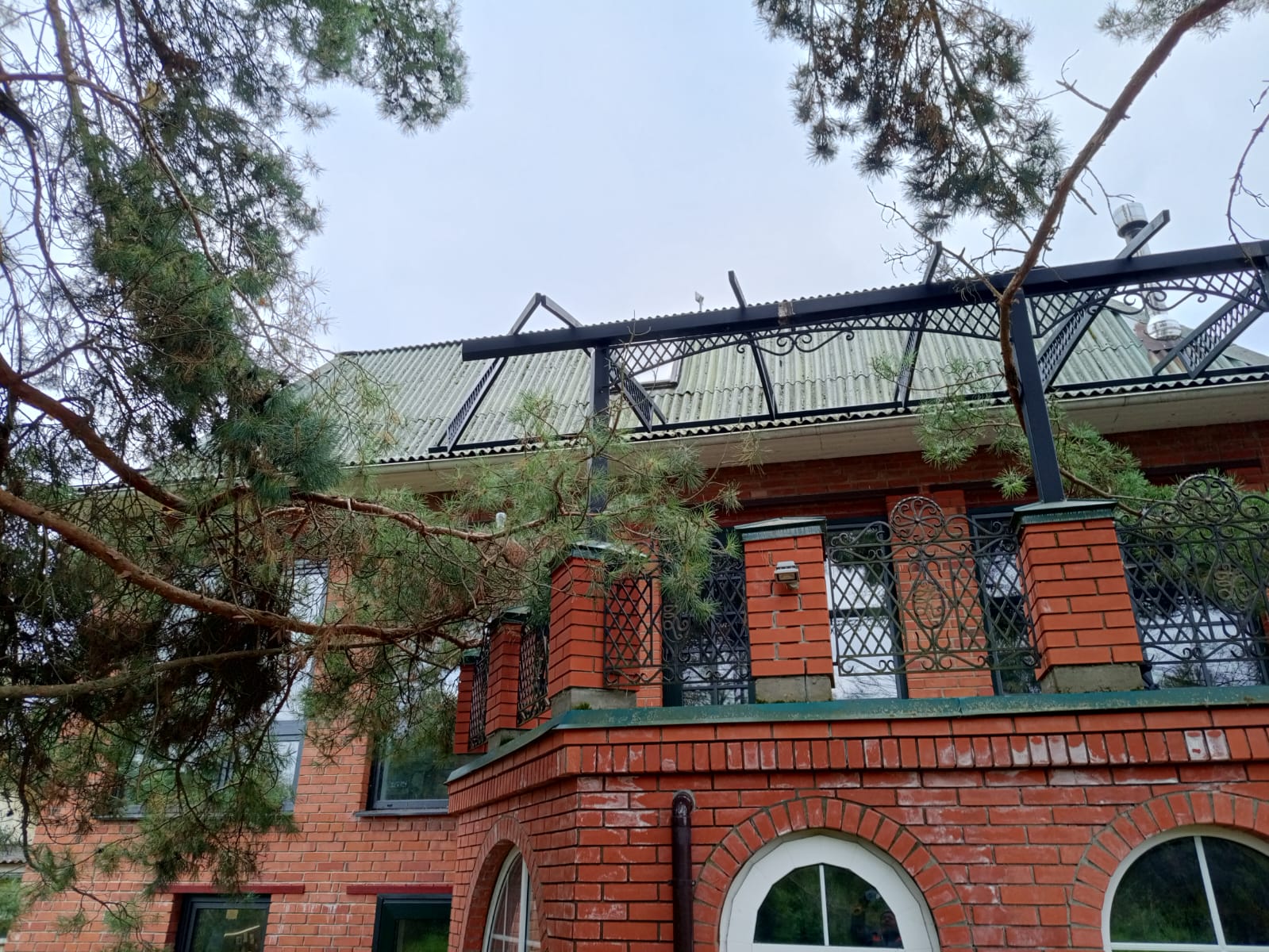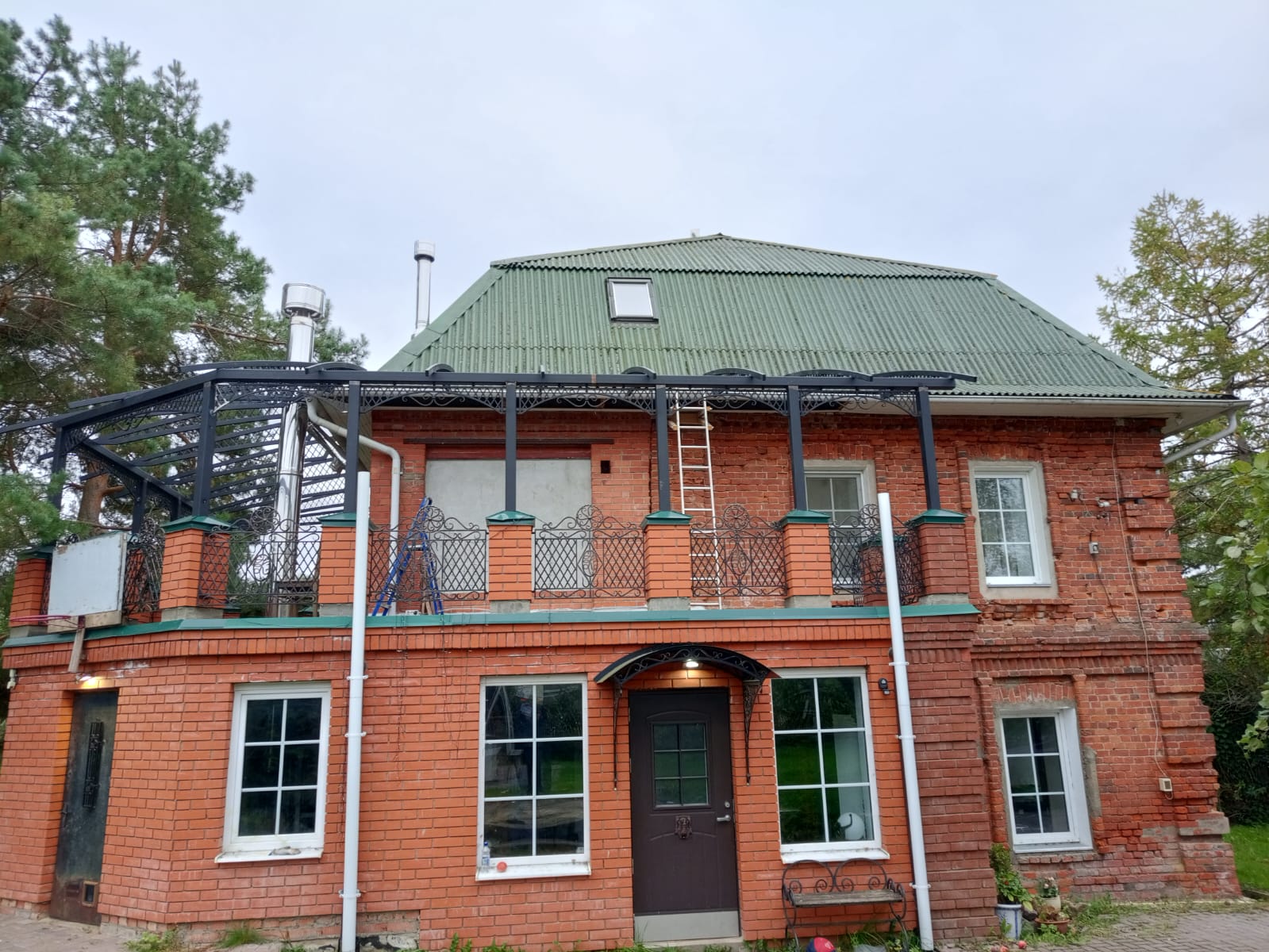 Горизонтальная балка закреплена на крыше, вертикальные стойки соединяются с кирпичными ограждающими столбами. Чёрный металл (внешнее покрытие — порошковая износостойкая краска WS-Plast) красиво сочетается с кирпичным фасадом, и делает внешний вид здания более выразительным. Все работы выполнены точно в срок, в соответствии с технологическими правилами и нормативами. Клиент остался полностью доволен результатом.
