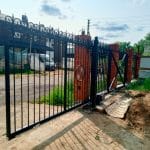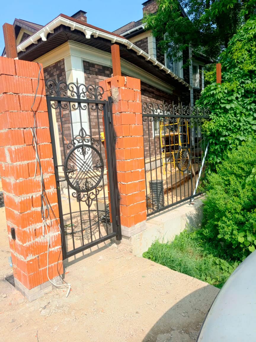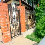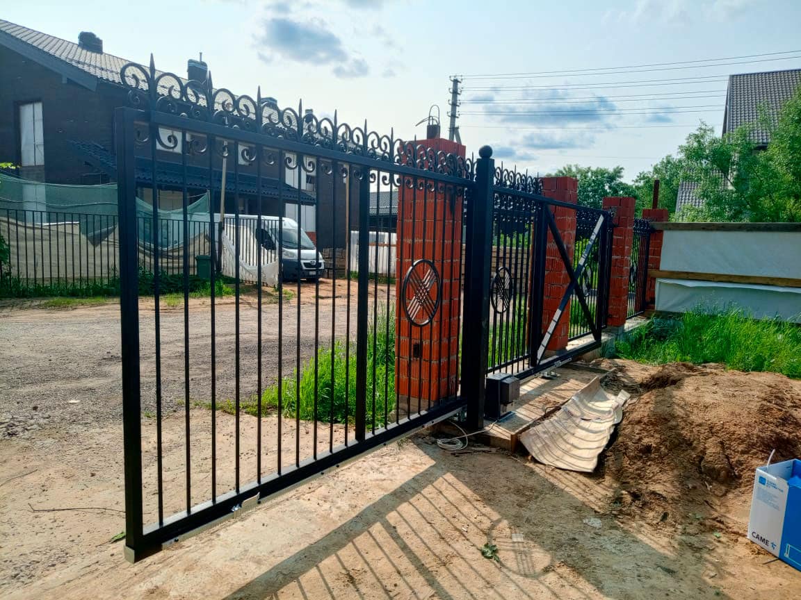 Клиент заказал кованое ограждение с калиткой и откатными воротами с автоматикой. Художественное оформление, согласно его пожеланиям, должно было быть лаконичным, и в то же время оригинальным. Секции кованого забора монтировались между массивными кирпичными столбами. В процессе изготовления заказа, появилась потребность в изготовлении закладных деталей под откатную автоматику.