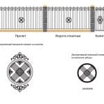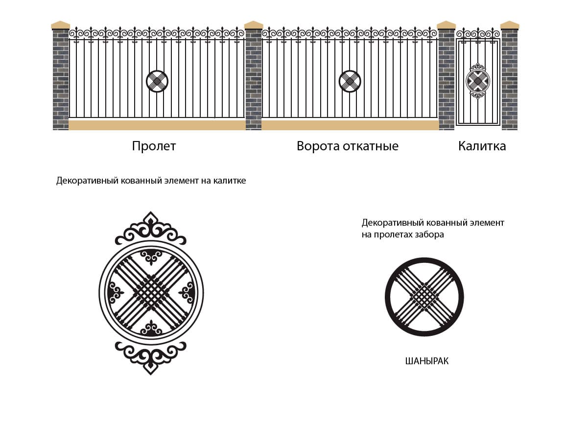 Для заполнения ограждения забора (учитывая стиль архитектурного и ландшафтного ансамбля) мы выбрали вертикальные прутья с фигурными остроконечными навредившими, соединяющимися между собой коваными завитками. В качестве упрочняющего и декоративного элемента использовались круглые вставки с крестоообразным рисунком (шанырак).